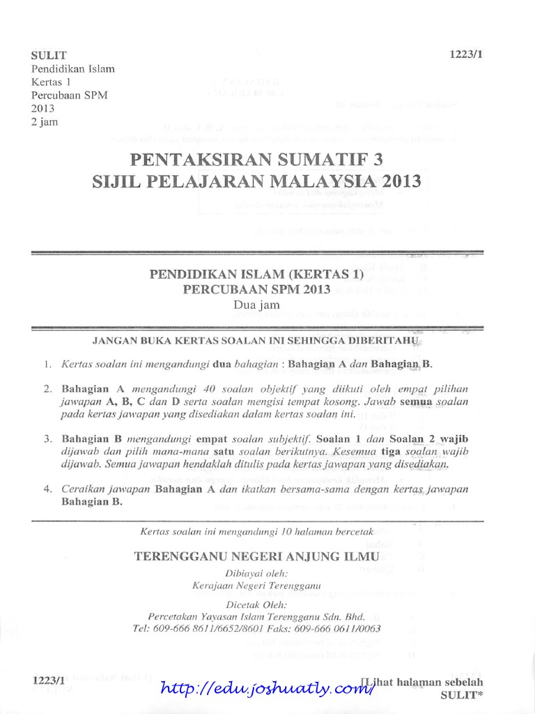 Soalan Spm Agama Islam Kertas 1. Calon yang tidak dapat menduduki mana-mana kertas peperiksaan bertulis atau melaksanakan ujian lisan khusus calon persendirian akan dianggap TIDAK HADIR bagi mata pelajaran berkenaan. Selain soalan-soalan percubaan negeri, kami juga mengumpul soalan-soalan percubaan SPM dari SBP dan MRSM dan juga soalan-soalan.